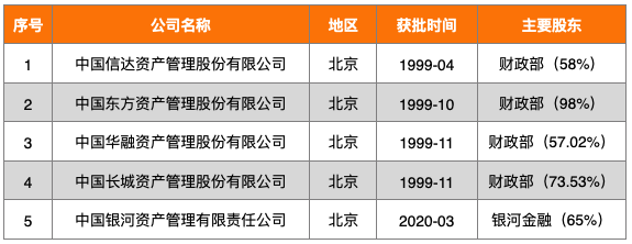 截至2021年2月,中國共有全國性AMC 5家,1999年批準成立4家,2020年新批準成立1家,注冊地均在北京。