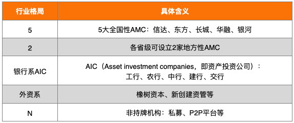 表1:不良資產處置行業“5+2+銀行系AIC+外資系+N”格局