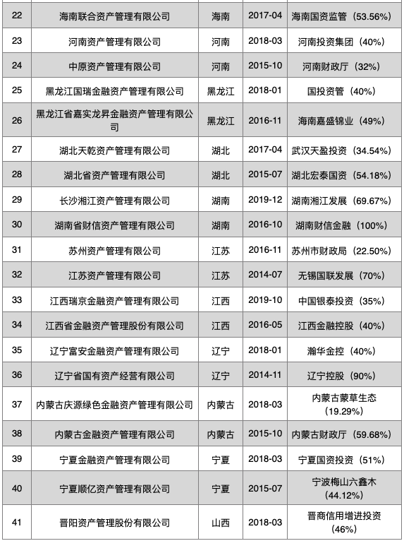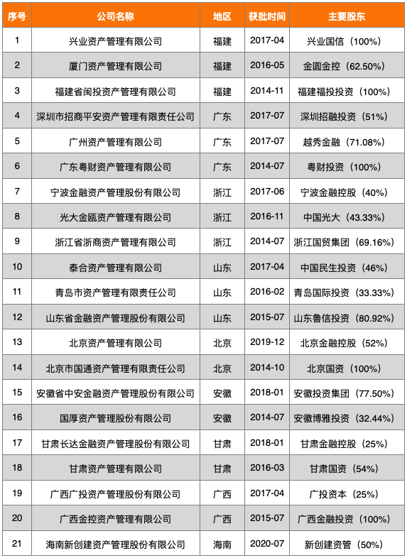 2020年2月,全球知名投資管理公司橡樹資本的全資子公司Oaktree(北京)投資管理有限公司在北京完成工商注冊,或為橡樹資本在境內的AMC牌照做準備;同年7月,海南省獲批第二家地方性AMC——海南新創建資產管理股份有限公司,新創建資產管理(中國)有限公司擁有其50%的股份,為首家外資控股的持牌地方性AMC。