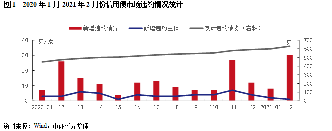 信用風險事件回顧:2021年1-2月份風險事件有53次,涉及19家發行人。其中,首次違約的債券39只,涉及15家發行人,其中4家主體為首次違約。具體看首次違約債券,從違約類型看,除 “20鴻達興業SCP002”和“17幸福基業MTN001”是交叉違約外,其余37只均為實質性違約。從違約事件看,實質性違約的13只債券均為本金利息項違約,24只海航系存續債券因進入破產重整程序而違約。從債券類型看,公司債14只,私募債11只,中期票據8只,企業債3只,定向工具1只,短期融資券1只。從企業性質看,新增的4家主體中,2家違約主體為民營企業,2家為地方國有企業。從上市情況看,新增的4家違約主體中除廣東太安堂藥業股份有限公司和華夏幸福基業股份有限公司外均為非上市公司。從處置方式看,6只債券的發行人與持有人達成延期兌付協議,其中,“19航空01”在展期后,目前進入破產重整,其他債券未公布處置信息。