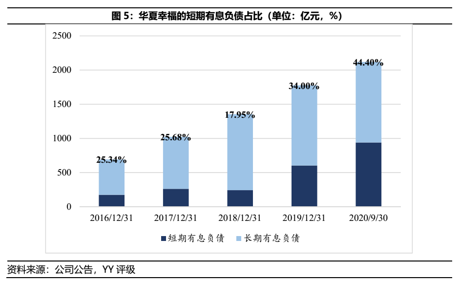 除了有息債務(wù)規(guī)模上升快速外,高風(fēng)險(xiǎn)業(yè)務(wù)模式和民企背景等因素限縮了華夏幸福融資渠道,導(dǎo)致其短期有息負(fù)債占比攀升快速。