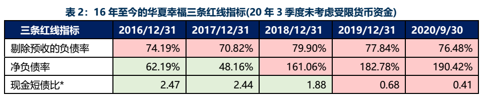 在平安戰(zhàn)略入股的180億元之外,華夏幸福近年的業(yè)務(wù)仍是依賴借外債模式支持,而業(yè)務(wù)模式上的資金回流緩慢仍是其最大弊病。從三條紅線指標(biāo)動(dòng)態(tài)變化可見(jiàn),18年后高有息負(fù)債壓垮了華夏幸福的依靠業(yè)務(wù)翻身的機(jī)會(huì)。