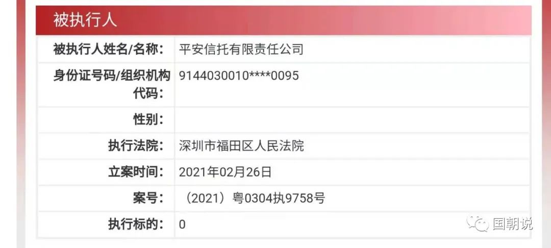 2021年2月26日,平安信托有限責(zé)任公司被深圳市福田區(qū)人民法院列為被執(zhí)行人,案號(2021)粵0304執(zhí)9758號,執(zhí)行標(biāo)的顯示為“0”元,由于中國執(zhí)行信息公開網(wǎng)上并沒有提供更多信息,從案號上來看,這或許跟一樁集合信托糾紛案有關(guān)。