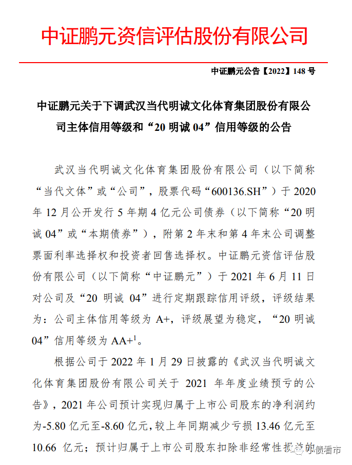 4月11日,中證鵬元公告稱,將當代文體(600136.SH)主體信用等級由A+下調(diào)為A-,評級展望由穩(wěn)定調(diào)整為負面,同時將“20明誠04”信用等級由AA+下調(diào)為A3。