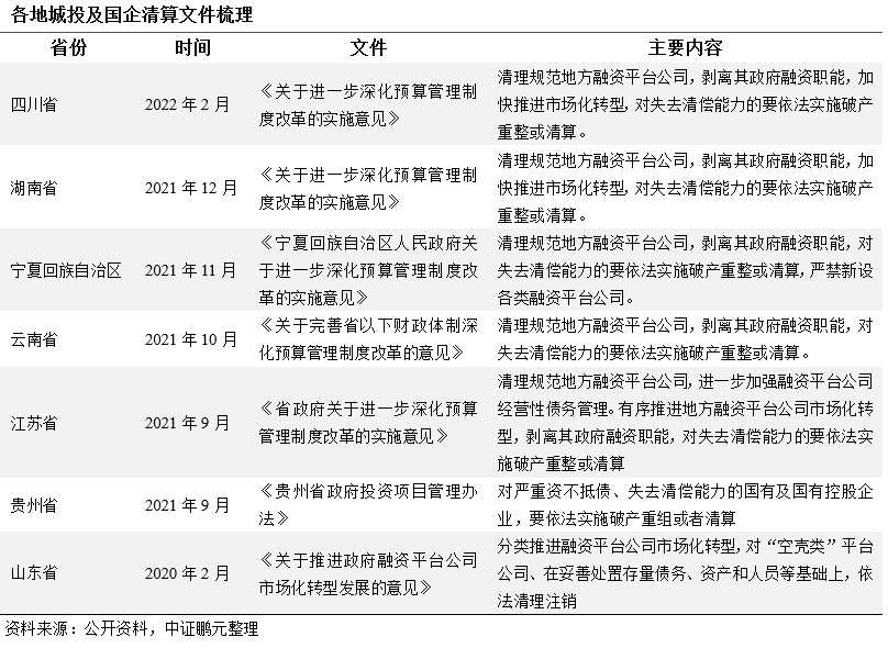 2018年9月,中共中央辦公廳、國務院辦公廳印發的《關于加強國有企業資產負債約束的指導意見》提出,對嚴重資不抵債失去清償能力的地方政府融資平臺公司,依法實施破產重整或清算,堅決防止“大而不能倒”,堅決防止風險累積形成系統性風險。2021年4月,國務院公布《關于進一步深化預算管理制度改革的意見》【國發〔2021〕5號】提出,清理規范地方融資平臺公司,剝離其政府融資職能,對失去清償能力的要依法實施破產重整或清算,多省份沿用此表述。
