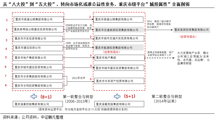 2010年6月10日,國務院印發《關于加強地方政府融資平臺公司管理有關問題的通知》(國發〔2010〕19號),各部委出臺了一系列文件,開始規范融資平臺的債務約束和轉型。2012年起,重慶“八大投”轉為“五大投”,此次轉型目標除兼并重組、降低債務、提高運營效率外,更重要的是調整產業結構,將城市基礎設施占比降到30%,提高工業服務業的發展,同時引導民營經濟集群發展,從而提供當地經濟發展質量、解決隱債問題。