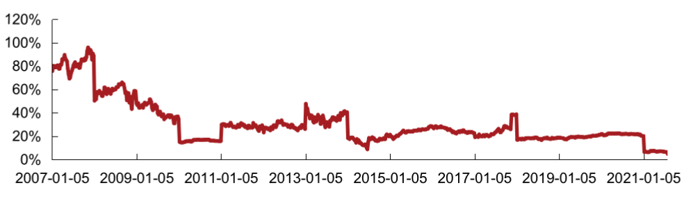 整體來看,7月克而瑞內房股領先指數成分股相對香港地產股大樣本整體PB較上月回落。7月該相對PB周均值為6.2%,低于上月相對PB周均值7.1%,低于2020年全年相對PB周均值21.9%。