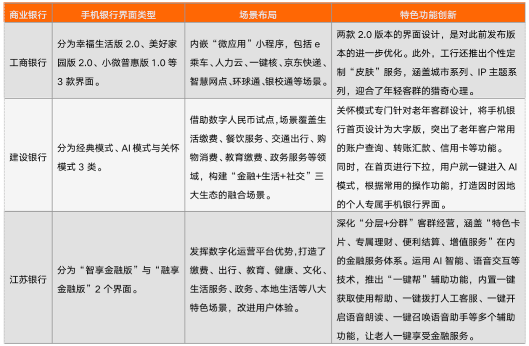 鑒于此,手機銀行必須做出差異化特色。近期,App適老化變革成為熱點,各家銀行先后推出針對細分人群的多個專屬界面,包括適老化版本。從下述工商銀行、建設銀行以及江蘇銀行的最新做法,可以看出在場景融入與功能創新方面的探索實踐: