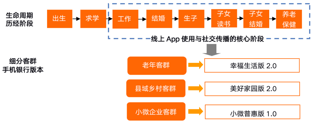 多種界面的手機銀行,也是圍繞人生必經的發展階段而展開設計。從出生、求學、工作到養老保健等環節,零售用戶與智能設備之間的智能連接關系日漸緊密。從手機銀行的使用客群年齡來看,主要是工作后的用戶群體為主。同時,針對不同身份特征的人群,手機銀行也細分為多個版本。工商銀行7.0版本手機銀行,分為三個細分人群專屬界面,即針對老年客群的幸福生活版2.0、針對縣域農村人群的美好家園版2.0、針對小微企業主的小微普惠版1.0,前兩個界面是對此前發布版本的進一步優化。