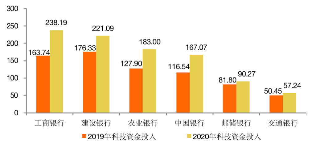 零壹智庫研究發現,6家國有大行近兩年的科技資金投入逐步加大,尤其是工商銀行最高,2020年末達到238.19億元。零壹智庫注意到,工商銀行的智慧引擎所展現的強大科技實力,源自其早在2017年啟動設立的云計算、大數據、人工智能、區塊鏈、物聯網等七大創新實驗室,目前建立起一支涵蓋開發、測試、運維等于一體、規模達到數萬人的科技隊伍,技術實力長期以來處于銀行業領先水平。