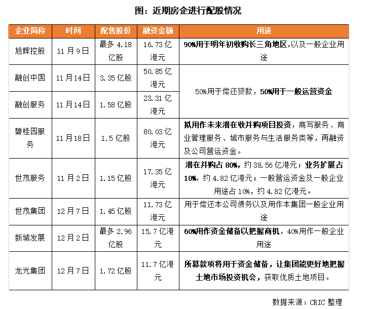 在政策回暖的同時,房企也在積極自救,通過項目轉讓、股東借款等方式補充現金流,還有部分房企繼續通過配股融資的方式募集資金,為新一輪的償債潮做準備,也為明年新一輪的投資機會儲備資金。