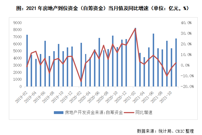 從房地產開發企業到位資金(自籌資金)來看,11月單月值為6761億元,單月資金量年內僅次于6月,從增速來看,同比增長2.1%,增速自8月后首次重新回正。
