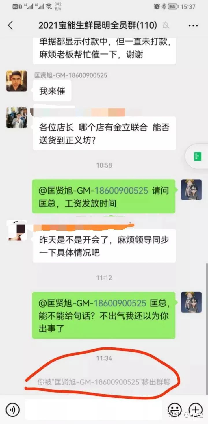 昆明寶能生鮮的員工在工作群問工資發(fā)放時間,并艾特城市總。一刻鐘后,見剛剛還活躍的領(lǐng)導(dǎo)沒有回話,這位員工再次詢問“能不能給句話?不出氣我以為你出事了”。