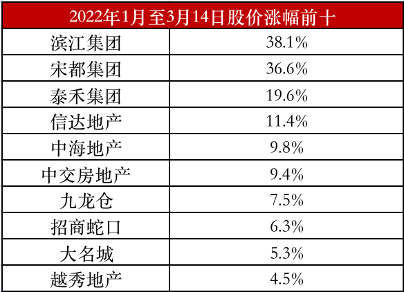 對比2021年1月開盤價,從88家樣本房企股價均值來看,2021年1月開盤88家房企股價平均值為7.88元,2022年3月14日88家樣本房企股價均值較去年1月下降27%。88家樣本房企中,僅有12家房企股價上漲,其中股價上漲房企多為央企和國企,無論是A股還是港股的內房股,走勢都出現分化明顯,保利、中海、招商蛇口等國企、央企性質的地產公司表現強勢。