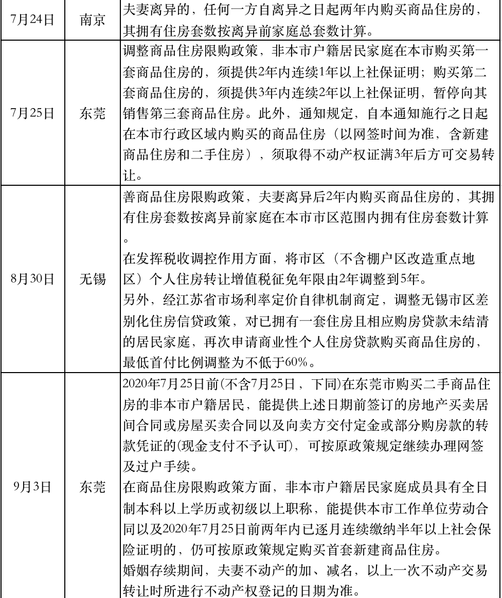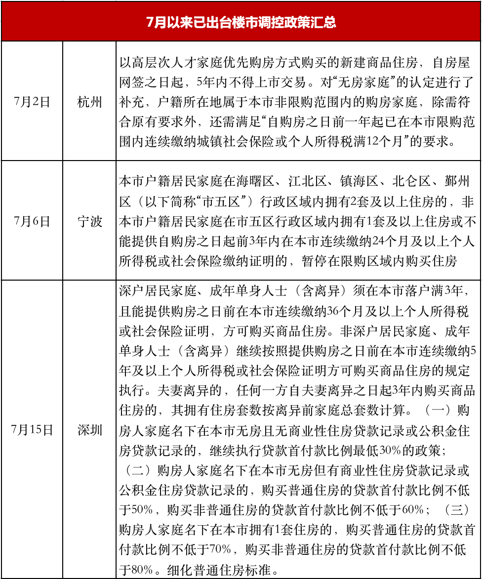 隨后,浙江臺(tái)州、麗水、海鹽等多個(gè)三四線城市發(fā)布樓市調(diào)控政策,掀起了新一輪三四線城市調(diào)控新周期。自7月熱點(diǎn)二線城市紛紛加碼調(diào)控至今,地方因城施策,調(diào)控正逐漸深入至三四線城市,未來調(diào)控大概率將繼續(xù)維穩(wěn),以更好地落實(shí)穩(wěn)地價(jià)、穩(wěn)房?jī)r(jià)、穩(wěn)預(yù)期的長(zhǎng)期目標(biāo)。