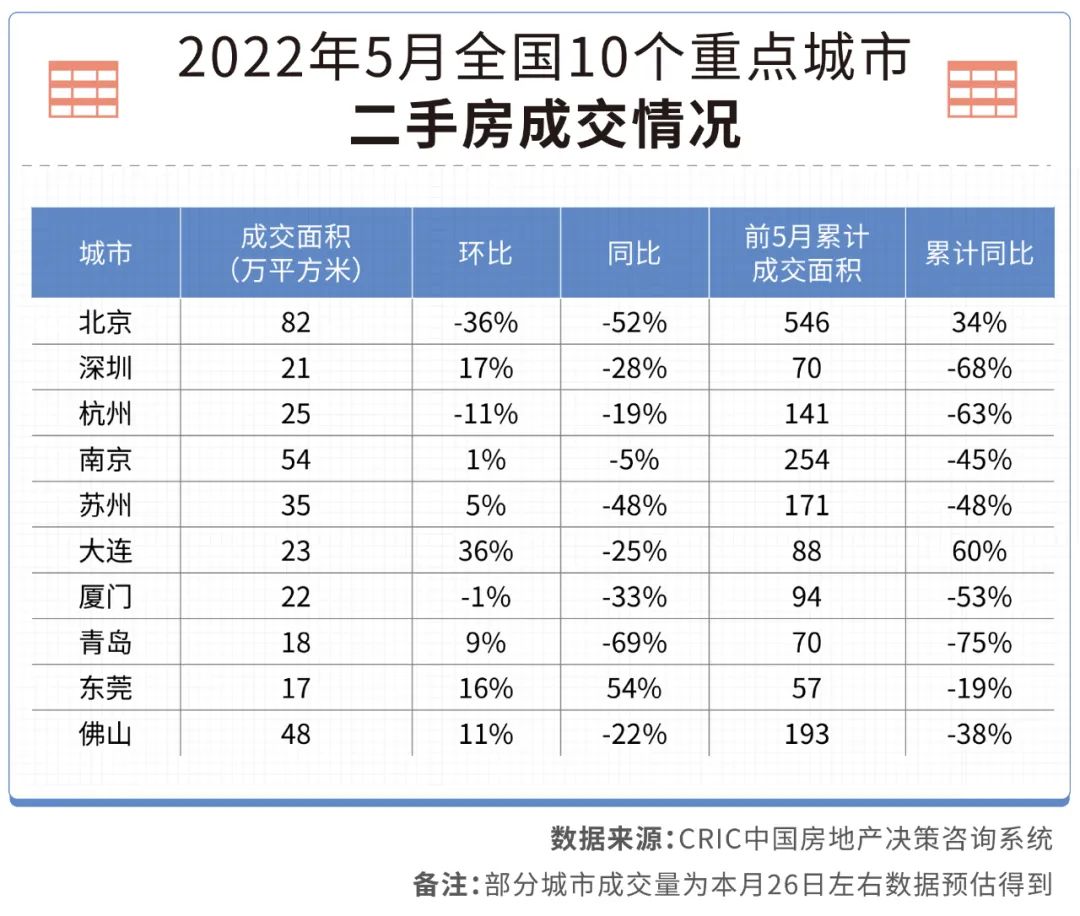 數據顯示,10個重點城市成交面積同環比齊降,前5月成交面積累計同比下降46%。