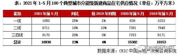 據(jù)CRIC統(tǒng)計,2021年1-5月全國100個重點城市商品住宅新增供應面積18930萬平方米,同比增長23%,相較2019年同期增長4%。