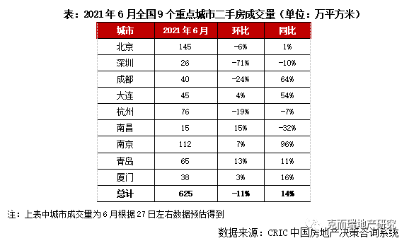 二季度末,各省市成交規(guī)模持續(xù)走低,經(jīng)歷“小陽春”市場顯著放量,年中市場逐漸恢復理性,月成交規(guī)模穩(wěn)步“三連降”。整體來看,6月全國9個重點城市二手房成交體量為625萬平方米,環(huán)比回落11%,同比仍有14%增幅。