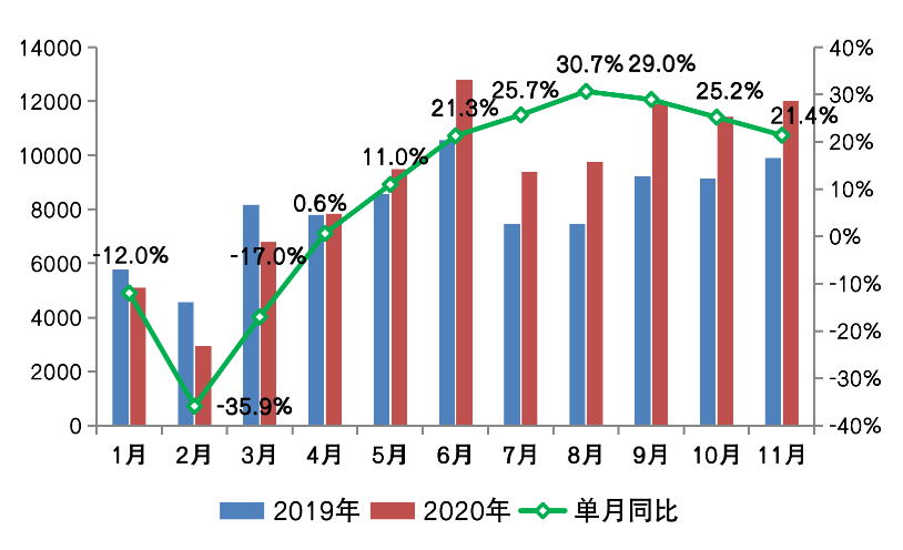 圖:2020年1-11月百強(qiáng)房企單月銷售操盤金額及同比變動(dòng)(億元)