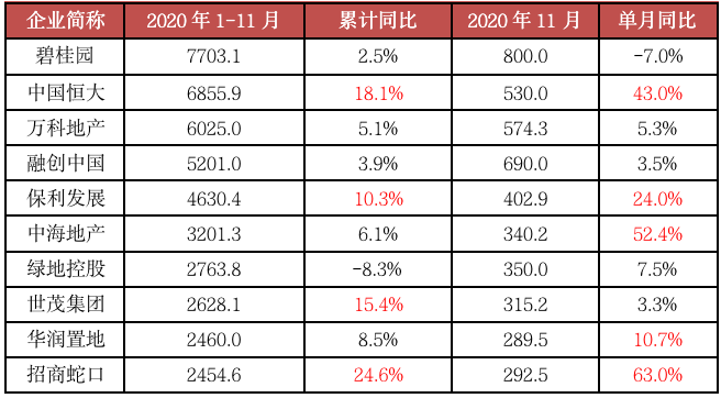 表:2020年1-11月全口徑銷售TOP10房企業(yè)績表現(xiàn)(億元)