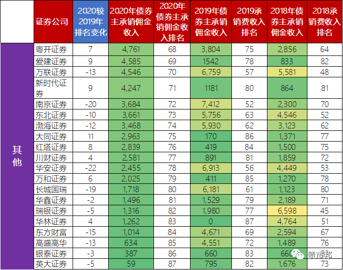 方正證券、五礦證券、安信證券、中天國富證券、華金證券、民生證券、信達證券和東亞前海表現亮眼,均較2019年在承銷費收入和排名上有著較大幅度增長。
