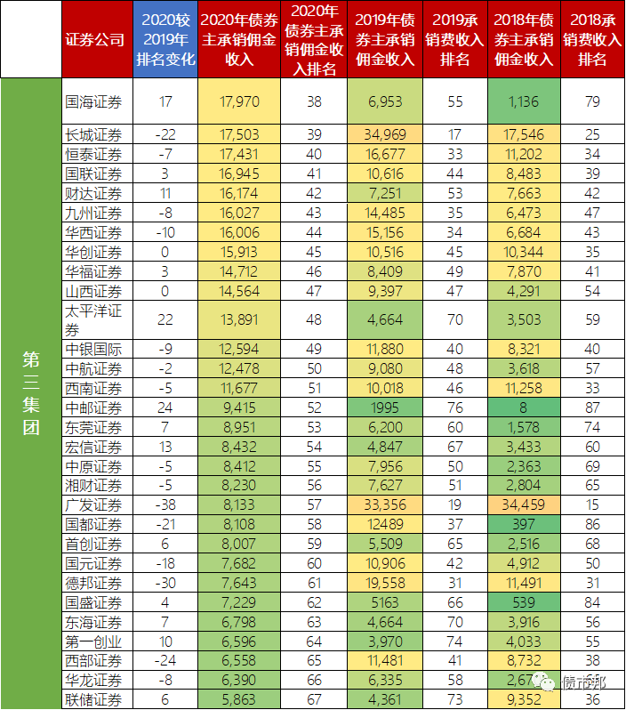 第三集團的變動比較大,里面有慢慢恢復元氣的國海證券,也有曾經行業排名前列的老牌投行廣發證券,因為康美藥業受到監管處罰,暫停債券投行業務12個月,承銷費收入較2019年打了2折,掉入到了第三集團。