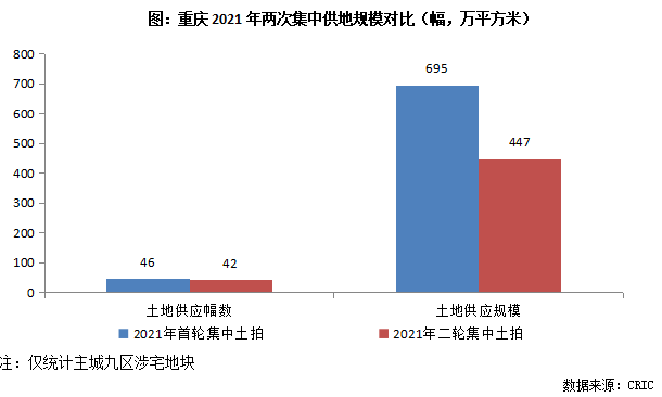 從土地供應(yīng)規(guī)模上來(lái)看,重慶(僅考慮主城九區(qū))二輪集中土拍供應(yīng)宅地較首輪明顯減少,涉及42宗宅地,總供應(yīng)建面僅447萬(wàn)平方米,較首輪總供應(yīng)規(guī)模減少了36%;分區(qū)域來(lái)看,北碚區(qū)、沙坪壩區(qū)和九龍坡區(qū)等環(huán)線外區(qū)域土地供應(yīng)比較集中,分別有9、8、8宗,南岸區(qū)、渝北區(qū)、巴南區(qū)、江北等區(qū)域供地相對(duì)較少,均不足5宗。