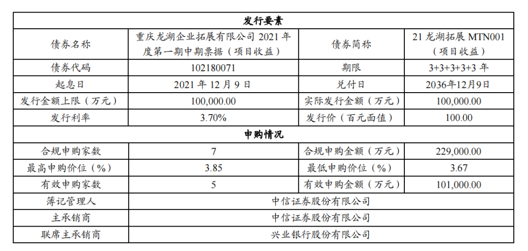 在此之前的12月10日,龍湖控股集團(tuán)有限公司發(fā)布公告,公司間接附屬公司重慶龍湖企業(yè)拓展有限公司已于2021年12月7日及8日公開(kāi)發(fā)行2021年度第一期中期票據(jù),規(guī)模為人民幣10億元。期限15年,票面利率3.70%。