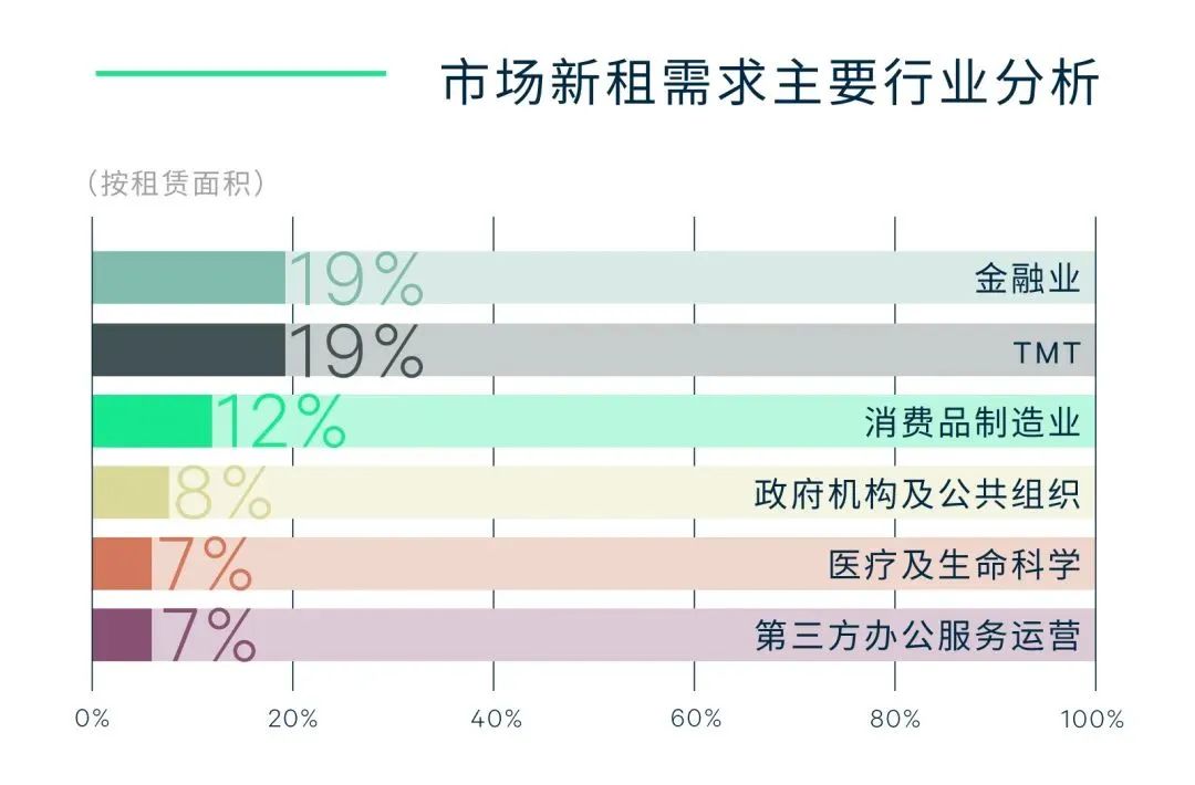 行業需求方面,在上海加大金融開放力度的背景下,全市場注冊制逐步推進為資本市場體制擴容,一方面已有的銀行、基金類公司需求較為穩定,另一方面也吸引了國內外新銀行或資管在上海新設網點或成立新公司。季內以證券、基金、資管擴租為主的金融需求進一步激活,與TMT一起位居首位,占比均為19%。