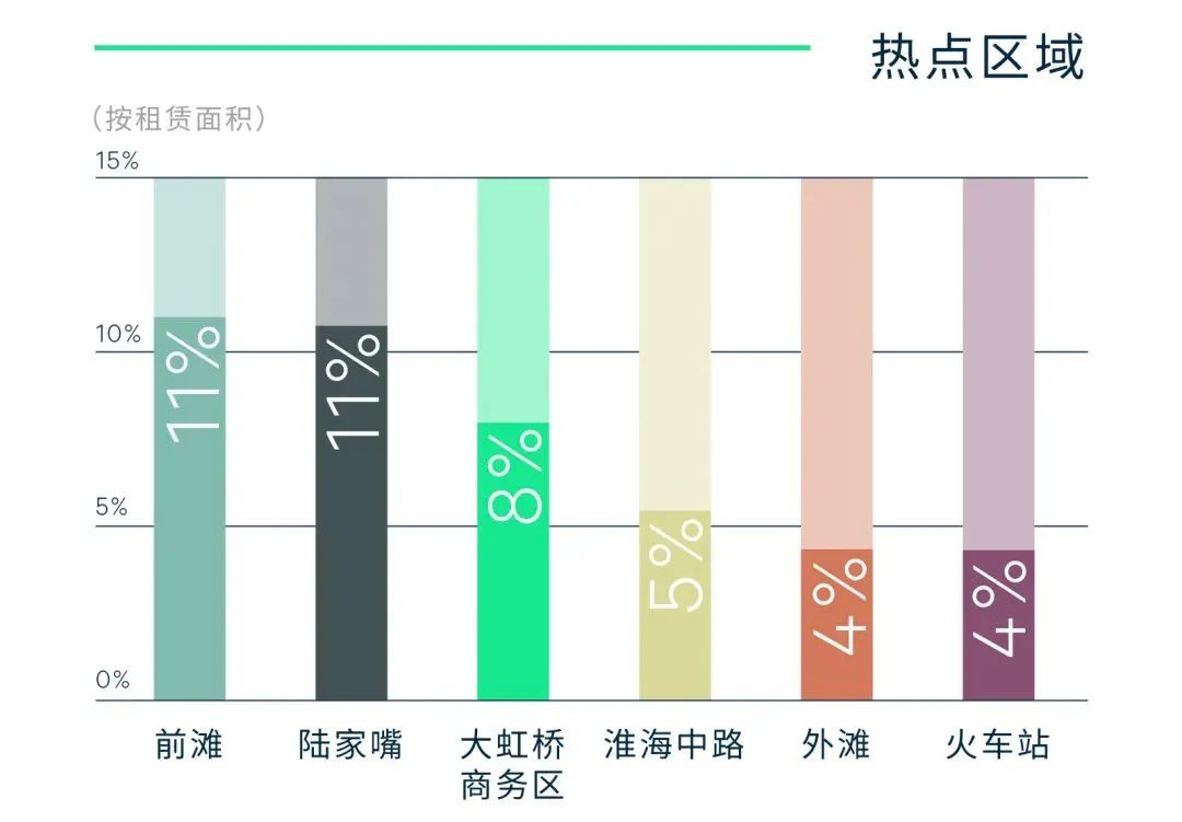 區位表現上看,南京西路、淮海中路可租面積減少帶動部分核心拓展區如北外灘、火車站、四川北路以及其他新入市項目去化持續改善,而濱江新興區域前灘、世博后灘優質樓宇持續吸引醫藥及工業制造業等搬遷擴張,大虹橋商務區則錄得政府機構職能建設的整棟辦公需求帶動板塊整體去化。