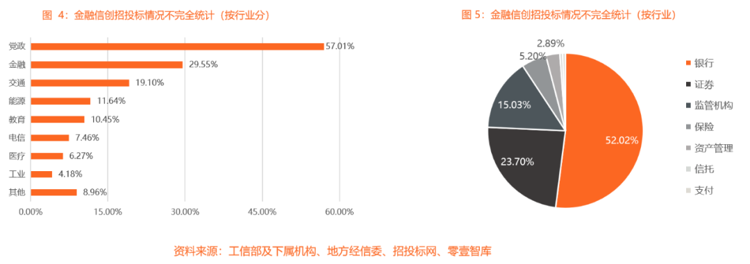 另據零壹智庫對金融行業信創招投標項目不完全統計,金融信創起步于2020年7月左右,項目多以OA辦公系統為主。直至2021年,信創需求激增,其中銀行為主力軍,占項目總數的一半以上;其次,證券公司和金融業職能監管部門項目量合計占近4成。