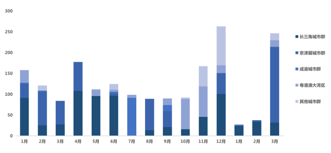 從城市群來看,前2個(gè)月長三角城市群成交總額遠(yuǎn)超其他城市群,而3月,京津冀城市群成交總額快速拉升。