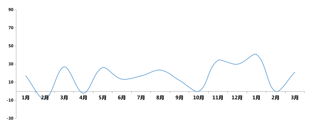 圖:2020年1月-2021年3月外資凈投資額變化趨勢(shì)