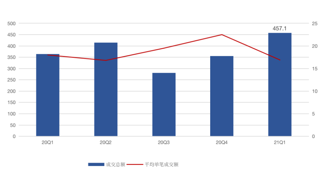 受益于辦公資產(chǎn)在大宗市場(chǎng)的活躍表現(xiàn),2021年一季度大陸地區(qū)單筆成交額超1億元人民幣的商業(yè)地產(chǎn)共成交27筆,交易總額達(dá)到457億元,同比上漲25.7%,環(huán)比上漲28.6%。延續(xù)了前兩個(gè)季度的增長態(tài)勢(shì)。