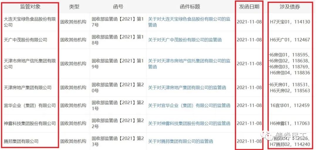 根據(jù)深圳證券交易所2021年11月8日披露的公開信息,騰邦集團(tuán)有限公司、神霧科技集團(tuán)股份有限公司、宜華企業(yè)(集團(tuán))有限公司、天津房地產(chǎn)集團(tuán)有限公司、天廣中茂股份有限公司、天津市房地產(chǎn)信托集團(tuán)有限公司、大連天寶綠色食品股份有限公司等6家發(fā)行人,因?yàn)槲丛谝?guī)定時(shí)間內(nèi)披露2021年半年度報(bào)告,被深圳證券交易所予以書面警示。