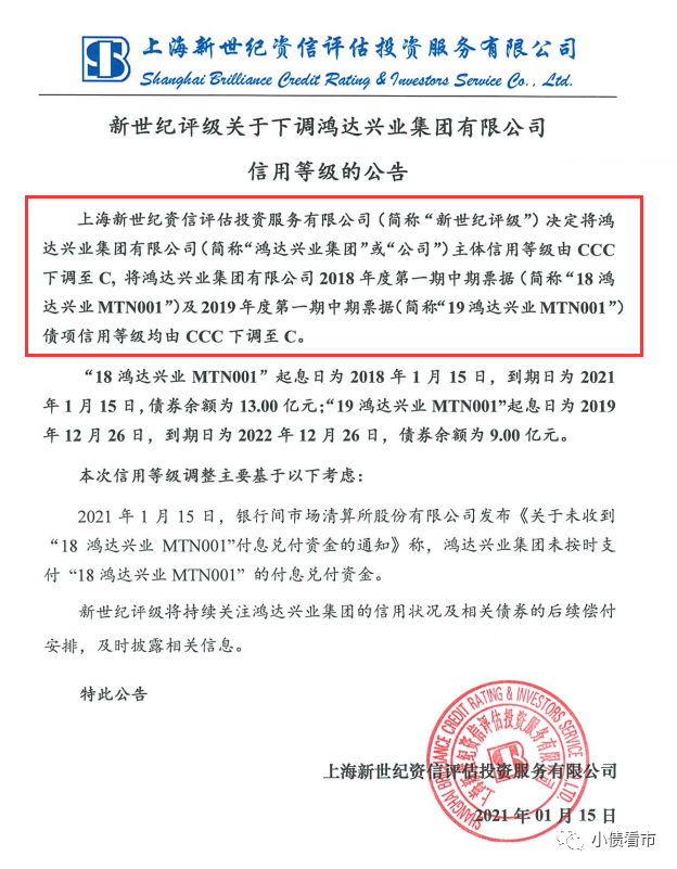近日,新世紀(jì)評(píng)級(jí)將鴻達(dá)興業(yè)集團(tuán)有限公司(以下簡(jiǎn)稱“鴻達(dá)興業(yè)集團(tuán)”)主體和“18鴻達(dá)興業(yè)MTN001”、“19 鴻達(dá)興業(yè)MTN001”債項(xiàng)信用等級(jí)由CCC下調(diào)至C。