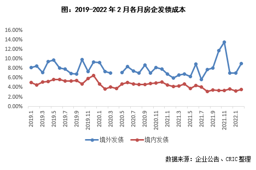 2022年2月100家典型房企新增債券類融資成本4.02%,環比下降0.89pct,同比下降0.87pct。其中境內融資成本3.58%,環比上升0.37pct;境外融資成本9.05%,環比上升3.02pct,主要由于境外債券僅發行了兩筆,其中銀城國際發行的1.65億元境外優先票據成本達到13.00%,從而拉高了融資成本。2021年截至2月100家典型房企新增債券類融資成本4.61%,較2021年下降0.68個百分點,其中境外債券融資成本達7.16%,上升0.14個百分點,境內債券融資成本3.39%,較2021年下降0.67個百分點。