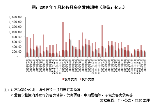 2月房企共發債248.47億元,環比下降47.6%,同比下降24.6%。其中,境外發債19.87億元,環比下降90.7%,同比下降84.3%,本月只有綠城完成了1.5億美元優先票據的發行以及銀城國際完成了一筆債券的交換要約,房企境外發債情況仍較為嚴峻。境內發債228.60億元,環比下降12.3%,同比上升12.8%,其中,公司債發行63億元,環比下降7.4%,同比上升39.4%;中期票據發行148.40億元,環比上升30.3%,同比上升642.0%;融資券發行17.2億元,環比下降78.2%,同比下降75.1%,在政策支持優質房企發行并購中票、住房租賃債券的情況下,房企的公司債、中期票據發行量有所上漲,同時短債發行量有所降低。