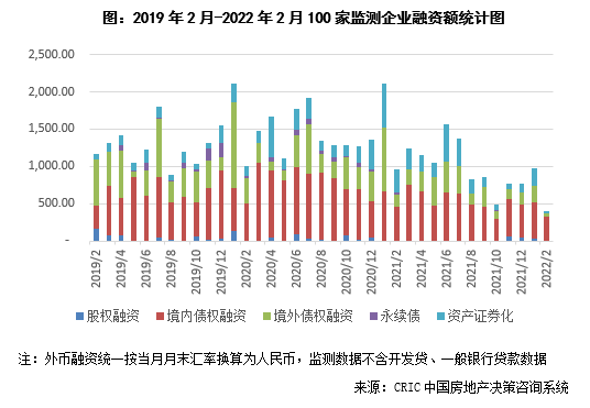 2022年2月100家典型房企的融資總量為398.17億元,環比下降58.9%,同比下降58.8%,融資量創2018年1月以來新低。一方面2月春節假期工作日相對較少,融資可操作時間相對較短;另一方面近期仍持續爆發企業債務危機,當前風險出清尚未完全,企業投資及發債也較為謹慎。從融資結構來看,境內債權融資318.63億元,環比下降34.0%,同比下降29.7%;境外債權融資52.33億元,環比下降75.9%,同比下降68.9%;本月資產證券化下降較為明顯,融資26.21億元,環比下降88.6%,同比下降91.6%。