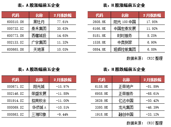 本月兩市的地產相關股表現都較為一般,A股地產股整月上漲的股票占比為了57%,而H股整月上漲的股票占比則僅為35%,同時大多數股票整月漲幅基本都低于10%。在H股方面,本月陽光100的月漲幅達到了17.95%,是H股漲幅最大的地產相關股。不過企業由于去年8月份曝出債務違約的原因,股價長期低迷,2月份甚至長期停牌,只是由于在2月11日大漲了18.75%使得公司股票整月漲幅達到了地產相關股的第一,企業本身的發展仍然需要觀察。