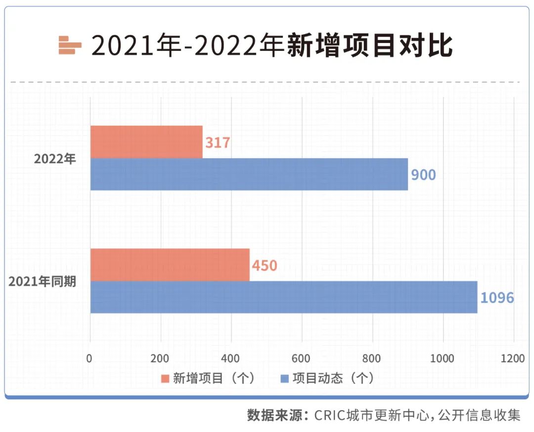 以廣深所在的大灣區為例,據2022年第一季度《廣東省三舊改造行業季報》統計,一季度大灣區內九市共監測到900個“三舊”改造(城市更新)項目動態,數量同比下降21.8% 。其中317個為新增進入初期階段的地塊/項目,新增項目動態同比下降42%,新增用地面積規模865.8萬㎡,用地面積規模同比下降29.9%。不論是項目新增、項目推進、項目體量同比均大幅度回落。