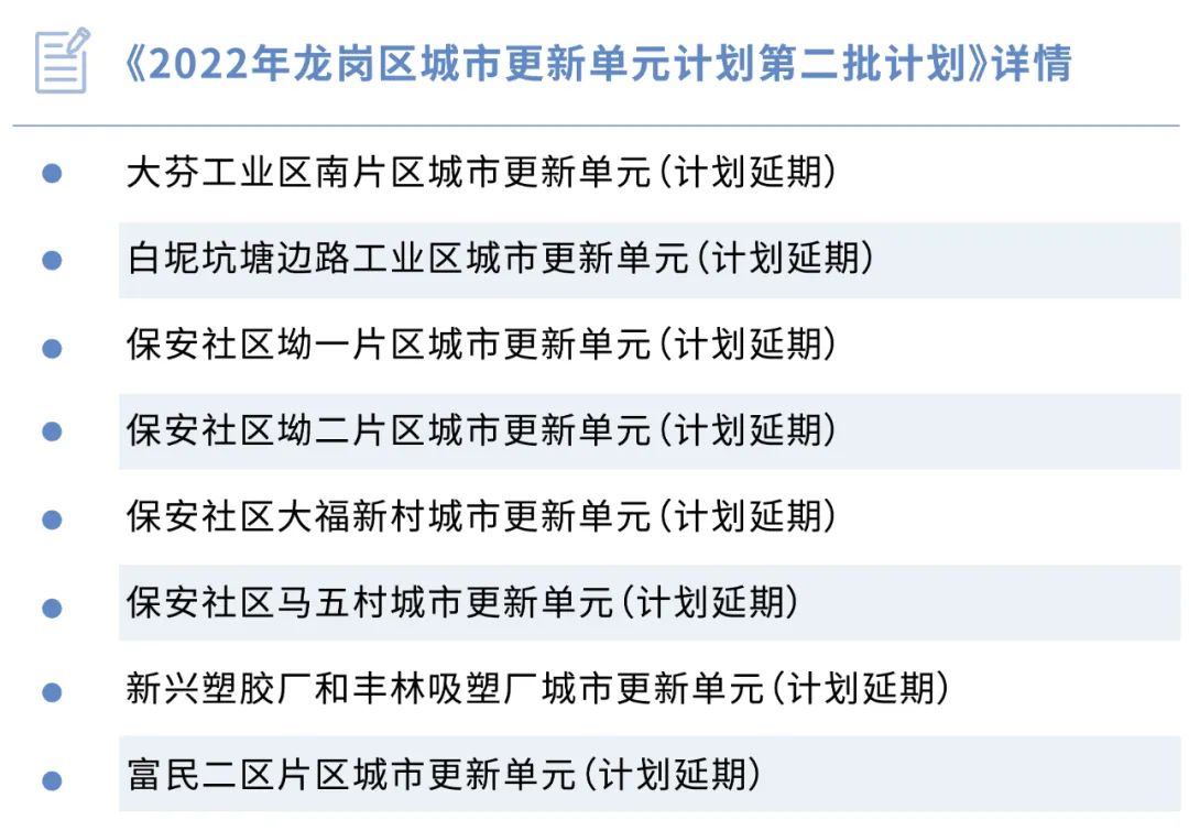 從5月6日深圳市龍崗區城市更新和土地整備局發布“《2022年龍崗區城市更新單元計劃第二批計劃》的公告中,更是所有的項目均被打上“計劃延期”標簽。