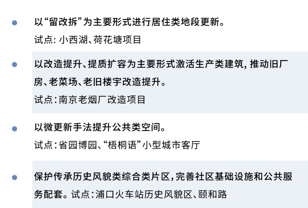 4月25日,南京市召開新聞發布會,公布《南京市城市更新試點實施方案》,《方案》包括總體要求、工作路徑、工作任務、工作步驟、保障措施等5個部分,計劃在“十四五”期間對居住類地段、生產類建筑、公共類空間、綜合類片區4類10個方面進行全要素、全方位更新,并著力探索城市更新的工作機制、實施模式、支持政策、技術方法和管理制度。重點聚焦玄武區、秦淮區、建鄴區、鼓樓區、棲霞區、雨花臺區,江北新區和其他各區重點單元和重點項目。其中各類型更新項目得到明確,值得關注。