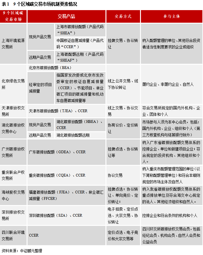 2011年10月,發改委發布《關于開展碳排放權交易試點工作的通知》(發改辦氣候[2011]2601號),同意在北京、天津、上海、重慶、湖北、廣東及深圳開展碳排放權交易試點。經過近2年的籌備,2013年初,除重慶和湖北外的5個試點地區碳排放交易場所通過發改委備案,2014年4月,重慶和湖北兩地碳排放交易場所也通過發改委備案。2013年6月至2014年6月期間,試點地區碳排放交易陸續開展,其中2013年6月18日,深圳試點率先啟動交易。2016年,在首批7個試點后,四川、福建也先后成為國家備案碳交易機構的省份,當年12月兩省碳排放交易場所先后啟動。至今,全國共有9個區域碳交易市場。碳交易市場是利用市場機制來控制和減少溫室氣體排放,推動綠色低碳發展。