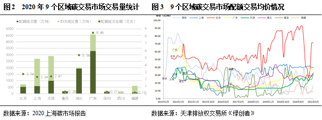 至今,全國共有9個區域碳交易市場。交易產品主要為碳排放配額和中國核證自愿減排量(CCER),除了現貨產品,上海和湖北還有遠期產品交易。2020 年,全國9個區域碳市場總交易量1.41 億噸,其中,配額成交量0.78億噸,CCER成交量0.63億噸。配額交易價格方面,北京均價最高(51.41元/噸),其次是上海(30元/噸)。各區域碳交易市場價格差別較大與各區域納入碳交易的行業范圍、標準、地區產業結構等多方面有關。