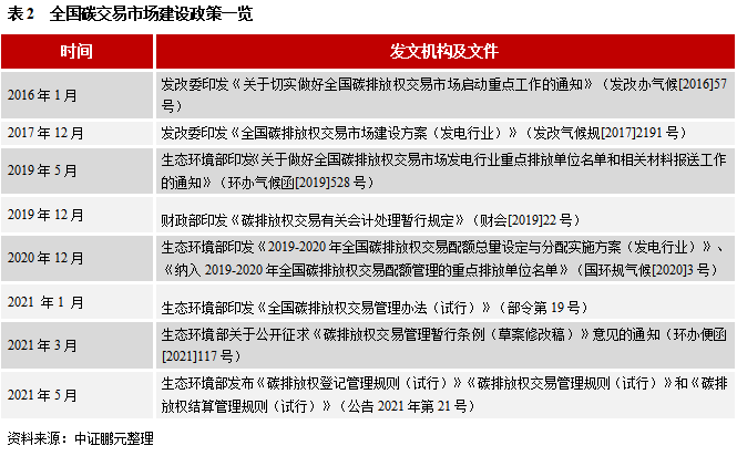 試點地區碳交易市場發展已有近8年,在促進試點省市企業溫室氣體減排方面取得了成效,同時為全國碳交易市場的建設提供了借鑒的基礎,在制度、人才、系統等方面積累了經驗。2017年12月,發改委印發《全國碳排放權交易市場建設方案(發電行業)》,正式啟動全國碳排放交易體系,按照先易后難、穩中求進的安排,在發電行業(含熱電聯產)率先啟動全國碳排放交易體系。2018年,應對氣候變化與發展碳交易市場職責從發改委轉到生態環境部。2021 年1月,生態環境部印發《全國碳排放權交易管理辦法(試行)》,自2021 年2 月1 日起施行,正式啟動全國碳市場第一個履約周期。2021年3月30日,生態環境部關于公開征求《碳排放權交易管理暫行條例(草案修改稿)》意見的通知。除了以上政策,還發布了多項配套政策制度、技術規范等。在全國碳排放權交易機構和注冊登記機構成立前,由上海環境能源交易所和承擔全國碳排放權交易系統賬戶開立和運行維護等具體工作,由湖北碳排放權交易中心承擔全國碳排放權注冊登記系統賬戶開立和運行維護等具體工作。