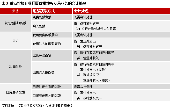 根據《碳排放權交易有關會計處理暫行規定》,重點排放企業在資產負債表中的“其他流動資產”項目下設“碳排放權資產”科目,其開展碳排放權交易業務的會計處理如表5所示。根據企業碳排放配額的獲取方式不同,交易業務的會計處理也不同。我們繼續以前文所述A企業和B企業為例進行說明。對A企業來說,其實際排放量小于免費配額發放量,所以無需購入配額來履約,如果最后A企業選擇將結余的10噸免費配額轉至下年度使用,則全程無需會計處理,如果最后A企業選擇將結余的10噸免費配額出售,則僅需在出售配額時做“借:銀行存款或其他應付款等 貸:營業外收入”會計處理,獲取營業外收入。對B企業來說,其實際排放量大于免費配額發放量,需要購入配額來履約,對于免費配額的獲取和履約無需會計處理,但是對于購入配額的獲取和履約則分別需要做如下會計處理“借:碳排放權資產 貸:銀行存款或其他應付款等”、“借:營業外支出 貸:碳排放權資產”。