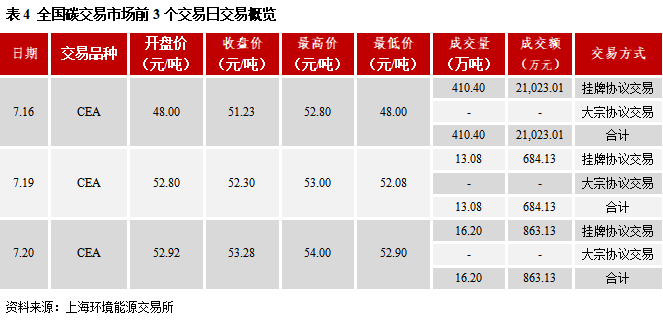 全國碳交易市場已于2021年7月16日開市。在全國碳排放權交易機構和注冊登記機構成立前,分別由上海環境能源交易所和湖北碳排放權交易中心承擔相關工作。開市3個交易日,碳排放配額累計成交量439.67萬噸,7月20日收盤價53.28元/噸,開市3個交易日實現三連漲。