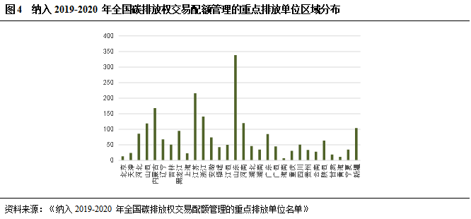 從納入2019-2020 年全國碳排放權交易配額管理的重點排放單位區域分布來看,排名前三的區域為山東、江蘇、內蒙古,分別有338家、216家、168家。