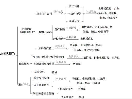 觀察上述兩只產品的交易結構可以看出主要可以分為兩個部分,專項計劃端(也可以說是項目端)及公募基金端,公募基金端的稅收相對比較清晰簡單,而專項計劃端因為結構較為復雜而導致稅收結構也較為復雜。對于公募REITs來說整個過程的涉稅環節主要有3個,分別是設立收購、持有運營和退出。